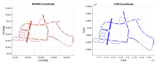The road shape information provided by the HD-MAP is supported by the World Geodetic System 1984 (WGS84) coordinate system format. Here, the location on the surface of the earth is expressed in terms of latitude and longitude using units of [°], which makes it less useful and intuitive when implementing an autonomous driving system [24]. Therefore, the map must be converted to the Universal Transverse Mercator (UTM) coordinate system in meters, with precision expressed in terms of latitude and longitude. It is easy to express the distance and direction in the case of UTM because all the coordinates on the surface are expressed as X[m] and Y[m] coordinates based on a specific origin. The process of converting the WGS84 coordinate system into UTM coordinates is given as follows [25]:
