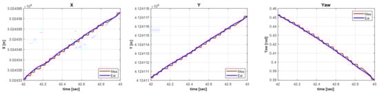 The period of the RTK-GPS data measurement value is lower than the period of the simulation, due to which the data are represented in a step shape, as shown in Figure 5. However, continuous position information for the test vehicle which is suitable for the simulation period is generated using the extrapolation method.