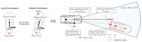 Here, the subscripts and represent the perception sensor mounted on the test vehicle and the point detected by the perception sensor, respectively. The parameter represents the relative distance based on the test vehicle; denotes the distance between the RTK-GPS mounted on the test vehicle and the recognition sensor; and denotes the distance between the RTK-GPS mounted on the target vehicle and the point detected by the perception sensor of the test vehicle.