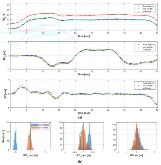 Figure 17a depicts Scenario 1 and Figure 17b depicts Scenario 2. In Scenario 1, the front target vehicle is autonomously driven at a fixed speed. Therefore, it exhibits a constant trend in the relative distance and relative speed after the steady state. In Scenario 2, the measured sensor data values are not constant when compared to those of Scenario 1 since the front target vehicle is manually driven.