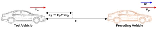 Here, denotes the acceleration of the host vehicle, and and denote the relative distance and target relative distance to the preceding vehicle, respectively. and represent the speed of the test vehicle and the preceding vehicle, respectively, and represents the safe braking distance. The state variable, , represents the error between the target relative distance, , and the current relative distance, , and represents the error between the speed of the preceding vehicle and the test vehicle. represents the safe braking distance, time gap, and speed of the preceding vehicle.