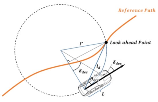 The pure-pursuit algorithm, which is a path-following algorithm, was used for the lateral control [46]. The pure-pursuit algorithm generates the target steering angle to reach the look-ahead point, which is the target point on the path to be followed, as shown in Figure 12. The generated target steering angle is calculated as follows: