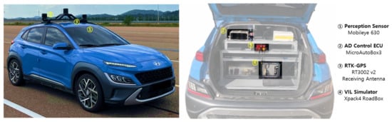 An autonomous vehicle based on the Hyundai Kona was used as the test vehicle, as shown in Figure 14. Mobileye 630 was used as the perception sensor to detect the surrounding vehicles, and a real-time ECU loaded with the autonomous driving algorithm was configured using MicroAutobox3 (MAB3). Additionally, the actual position of the test vehicle was measured using RT3002-v2, and the Xpack4 RoadBox, a real-time computing device, was used as a virtual simulator equipped with the VILS system proposed in this study. In the case of the vehicle test, information on the surrounding vehicles measured in Mobileye and the location information of RT3002-v2 are transmitted to the real-time ECU to perform the longitudinal and lateral control in autonomous driving. In the case of the VILS, the virtual surrounding vehicles and virtual location information generated through the virtual simulator are transmitted to the Real-Time ECU.