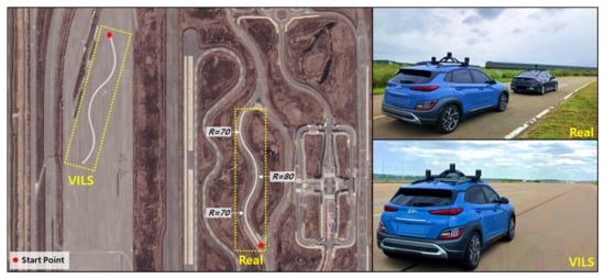 As explained in the previous section, the consistency of the VILS test results and vehicle test results is an important indicator to ensure that the proposed VILS system can achieve repeatability and reproducibility for a specific scenario. This is because VILS is implemented to replicate scenarios which are difficult to implement repeatedly in a vehicle test through a simulation and to replicate vehicle behaviors with similar tendencies. This section describes the vehicle configuration, test site, and scenario used for the actual vehicle tests and the VILS tests and analyzes the consistency of the test results from the two different environments.