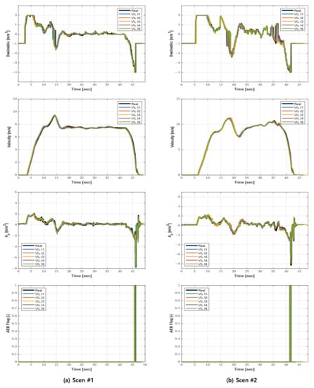 In both scenarios, the front target vehicle performs sudden braking at the endpoint of the driving target road; the test vehicle also implements control to activate the AEB. If the set TTC condition is not satisfied, the autonomous driving controller outputs an AEB Flag signal even though the minimum required acceleration calculated by the autonomous driving controller of is applied to the vehicle. Simultaneously, the acceleration command () required for sudden braking is input to the vehicle actuator.