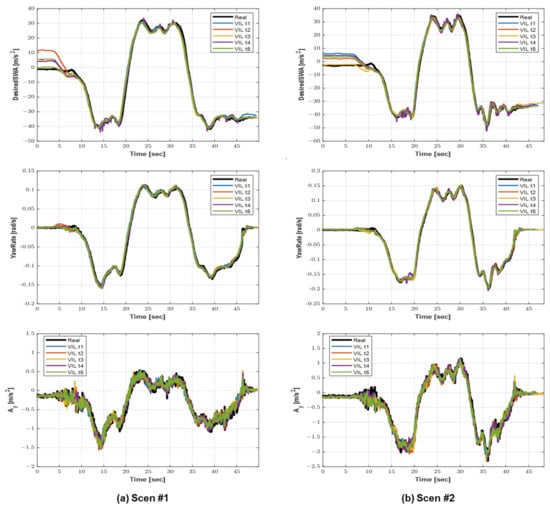 Figure 13 depicts the procedure used to verify the consistency between the vehicle test and the VILS test. Firstly, the target vehicle behavior required for the VILS scenario generation and the result data (Control Command, Vehicle Status, etc.) required for consistency verification are extracted from the various pieces of information obtained during the vehicle test. A VILS scenario is then generated using the extracted target vehicle behavior, and the VILS test result data are extracted. Time synchronization is performed based on the Time of Arrival (TOA), which is the time at which the VILS test data reaches a specific value, to compare the results obtained by performing the same VILS scenario several times [48]. The consistency was analyzed and the validity of the proposed VILS system was verified by comparing the time-synchronized VILS test results with the vehicle test results.