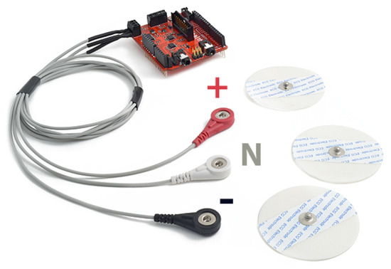 In this study, subjective experiments were conducted in order to collect the physiological and the voice signals by using a commercial sensor kit (i.e., e-Health platform) interfaced with a shield connected to an Arduino Uno board. The E-Health sensor shield allows the acquisition of nine biomedical signals. For our purposes, only two signals have acquired: ECG and GSR [28]. Since we are interested in identifying the QRS peaks from the ECG signal, this was band-limited using a low pass anti-aliasing filter with a cut-off frequency components of 100 Hz and data were recorded at 325 Hz. To guarantee a proper synchronization with signal recordings, the same setup was used for the GSR signal. The disposable ECG sensor electrodes (Figure 2) were placed on the body in the classical lead configuration considering the Right Arm (RA), the Left Arm (LA), and the Left Leg (LL). The skin conductance was measured at the base of two fingers (see Figure 3) of the left hand by measuring the electrical current that flowed as a result of applying a constant voltage. A preliminary recording was made of the ECG and GSR signals under resting conditions to obtain a baseline signal used during processing as a reference for the signals recorded in the different minutes of the tests.