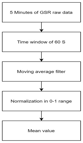 GSR is used for measuring sympathetic activation related to acute stress. As the skin conductance varies, the GSR can detect small changes [31]. The signal is processed according to the scheme reported in Figure 5.