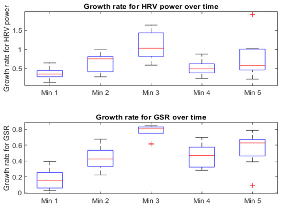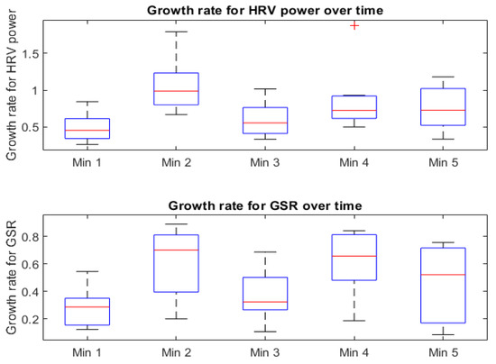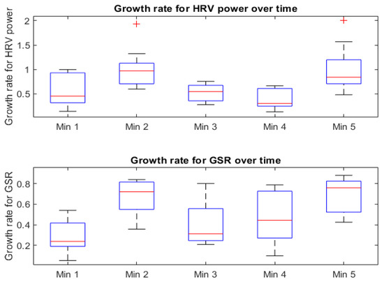 Similarly to other experiments, the significant differences in the growth rate for HRV power and GSR have been tested for minutes 1vs2, 2vs3, 1vs, 1vs4 and 1vs5. (i.e., refer Table 10).