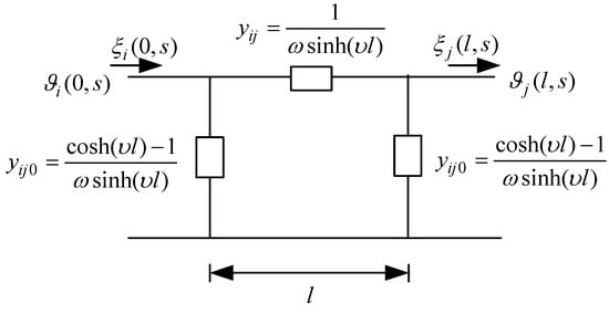 where and . Considering that the admittance matrix of the power system is calculated by the π-type equivalent circuit, this study will try to make the electricity, thermal, natural gas, and hydrogen energy storage models derived above also equivalent to the π-type circuit. Then, the study will obtain the generalized admittance matrix expression. Let x = 0, then, , ; furthermore, let l be the line length, let x = l, and combine the expressions of A and B; we can obtain , . Thus, the π-type equivalent circuit shown in Figure 3 can be established, where the indexes of the left and right bus are i and j, respectively.