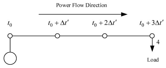 We consider a special branch (Figure 4) that initially has no power flow, and the time for power to flow from one bus to the next is . The influence of the power source on bus 1 (or a bus directly controlled by IDR) on the load on bus 4 (end of the branch) will be investigated below, . Suppose that a scheduling command is issued at time t, and the power source immediately issues one unit of power (or one power unit) whose length is one unit length in the pipeline. Moreover, suppose that is the set of each bus’s IQ at time t, and is the EQ of bus 4. In this case, Equation (48) can be rewritten as Equation (52):