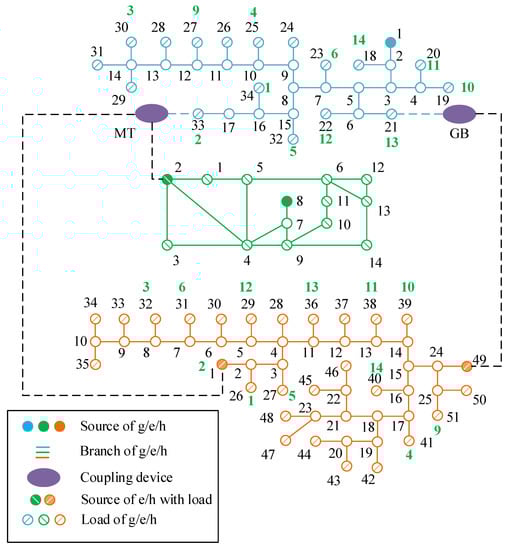 Figure 5 shows the system structure of the example, where “e” represents the power network, “g” represents the natural gas network, and “h” represents the thermal network. The black numbers in Figure 5 represent the bus index of each network, and the green numbers represent the position of the power system buses corresponding to nonpower system buses.