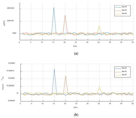 Pressure and flow curves of several buses: (a) curves of pressure fluctuation of buses; (b) curves of flow fluctuation of buses.