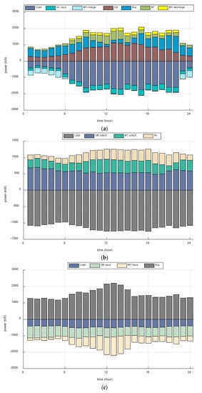 Figure 8 depicts a further simulation of the scheduling process on this day, which shows the optimal scheduling results of multiple energy equipment and loads. The upper part of the horizontal axis is the energy output, and the lower part of the horizontal axis is the energy input. “MH discharge” is the discharge power of MH, “MH charge” is the charging power of MH, “AC input” is the power consumption of the air conditioner, “Load” is the power load, “DG” is the power generated by DG, “Buy” is the power purchased, and “MT” is the electricity output of the MT.