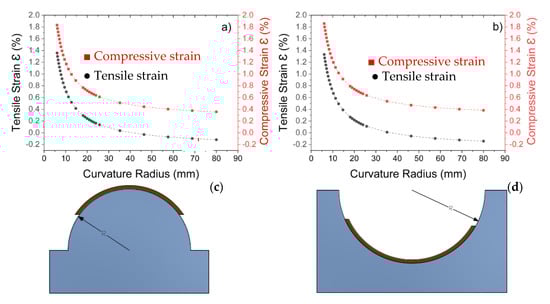 Total positive (tensile) and negative (compressive) mechanical strain vs. radius of curvature for (a) n-type and (b) p-type µc-Si: H thin film calculated using Equation (2), and schematic for the tensile (c) and compressive (d) bending direction.