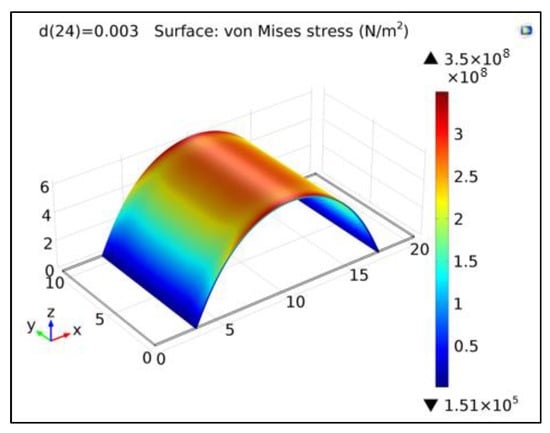 Numerical simulation of the stress distribution due to tensile stress for a µc-Si: H sample showing the zone of maximum stress. This was carried out generating a tetrahedral grid with 98,833 elements in a stationary mode as described in the experimental section.