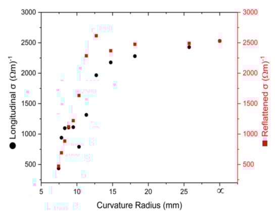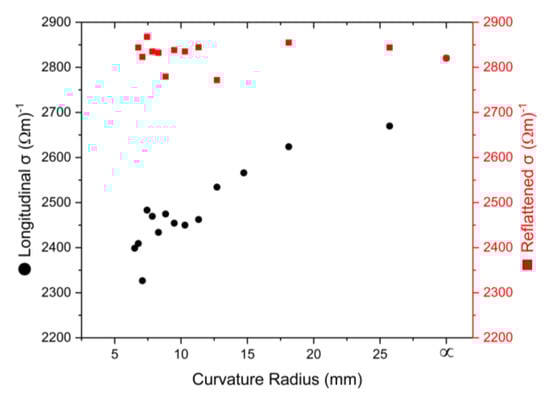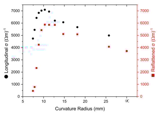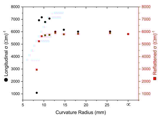Behaviour of longitudinal and re-flattened conductivity with radius for negative bending, at room temperature (20 °C). The former showed a decreasing trend reaching a minimum of 2399 (Ωm)−1 at 6.5 mm, while the latter remained stable in the whole range showing no mechanical failure.