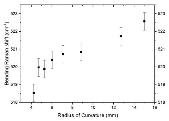 Bending Raman shift as a function of radius for tensile (positive) bending for a p-type sample. The Raman shift moves to lower values with decreasing radius suggesting the creation of a local tensile strain in the crystalline grains.