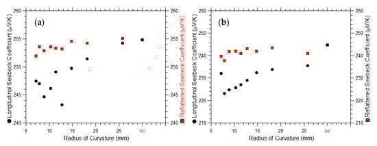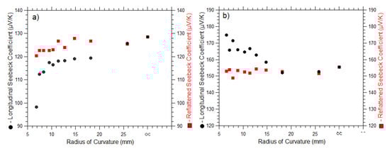 Similarly, the behaviour of the longitudinal Seebeck coefficient under compressive strain is shown in Figure 8b, alongside values following re-flattening. Initially, the longitudinal Seebeck remained stable at ~−155.5 µV/K up to a radius of 18 mm, followed but an increasing trend reaching a maximum of ~−175 µV/K at a radius of 6.5 mm, which represents an enhancement of about 13% over its unstrained value. An analogous qualitative enhancement was found in [40], but under a lower strain (−0.25%). The higher strain (6.5 mm →ε (%)= −1.7) needed to maximize the Seebeck is related to both the higher n-doping and the softening of the strain at the grain boundaries as cited in ref. [40]. The repopulation into the lowered Δ4 pockets (n = 6/4) in this strain case according to the Mott’s relation produces a Seebeck ratio of 0.76. This result justifies a less decrease in the Seebeck compared to the tensile case, but not an improvement. The increase should come from the raise of the electron effective mass attributed to the Δ4 pockets under compressive strain as found in [45].
