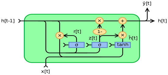 Another kind of RNN that can resolve the issue of vanishing gradients is called the GRU. Figure 3 demonstrates that the GRU, first described by [40,41,42,43], is analogous to LSTM but with fewer gates: one referred to as an update gate and another as a reset gate. The movement of data and information throughout the network is under the combined control of these two gates. The update gate is responsible for determining the quantity of data from the past that must be transmitted to proceed, while the quantity of information that will be forgotten is determined by the reset gate. The following equations provide a summary of the GRU: