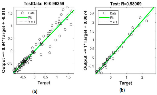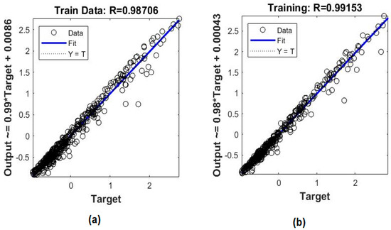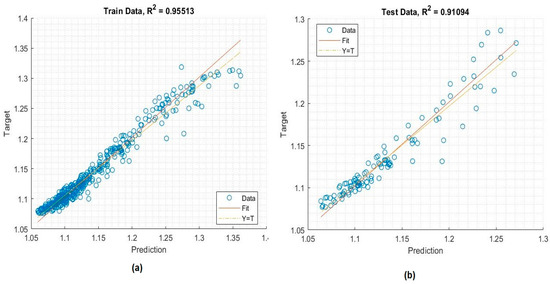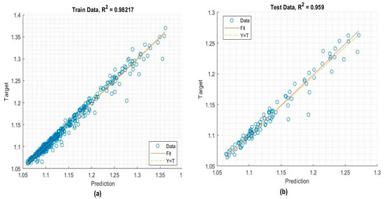 Therefore, while these models may estimate a value within a small percentage of the following day’s value, they are unable to tell us whether the cryptocurrency’s price will rise or fall that day. In addition, the GRU and MLP models’ architectures were built to utilize data effectively from the training and testing sets, and they are capable of accurately and reliably predicting price movements without compromising regression performance. Figure 9 shows the results of the GRU model with respect to R2 during the training and testing phases. It shows that the GRU model has achieved (R2 = 95.51%) during the training phase and (R2 = 91.09%) during the testing phase. Figure 10 shows the R2 results of the MLP model: it is found that the MLP has superior regression (R2 = 98.21%) during training and (R2 = 95.09%) during testing. A comparison between the presented GRU and MPL models and existing systems is presented in Table 4, proving that the proposed systems have achieved much fewer prediction errors.