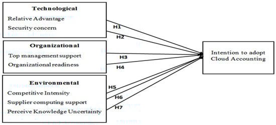 As the underpinning study model, TOE empirically outlines technological, organisational, and environmental elements as the three key determinants catalysing decision-makers’ innovation adoption or rejection [,] with a robust theoretical basis and thorough examination of innovation implementation and adoption []. This research categorised the TOE model constructs by reviewing relevant literature on IT or IS adoption and implementation within SMEs. The elements underlying all three primary contexts (see Figure 1) and hypothesis development are meticulously described in the following sub-sections given the plethora of classified factors that could impact the SME C-ACC adoption [].
