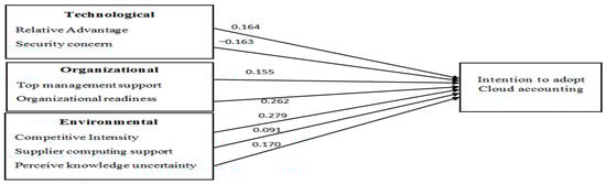 The Suppliers computing support positively and explicitly affected IA C-ACC within the Jordanian SME setting. Predictably, Suppliers computing support could support SMEs due to inadequate technological, human, and financial resources for infrastructural sustenance and development, which gradually leads to cloud-based system acceptance adoption. The SME decision for cloud-based system adoption is greatly subjective to cloud-computing providers’ trust and assurances in offering and maintaining distinct services. From SME managers’ perspective, service supplier support implies one of the most influential aspects, which ensures that SMEs would not encounter future complexities (data loss or availability) and continue to receive service testing and maintenance. Essentially, competitor’s intensity denoted the most substantial IA C-ACC determinant by Jordanian SMEs. The significant and positive competitor’s intensity influence on innovations adoption or acceptance also corresponded to past research [,]. In other words, SMEs that encounter competitor’s intensity are compelled towards innovation adoption or acceptance. The C-ACC adoption in SMEs occurs when such implementations catalyse competitiveness and business performance.