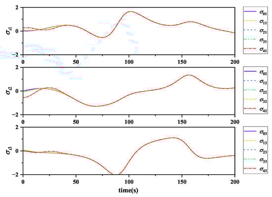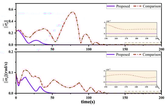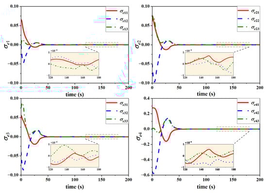 Therefore, it can be concluded that the attitude tracking errors converge to 0 as on the multi-spacecraft sliding-mode manifold . In the final part of this section, the time derivative of is deduced. Taking the time derivative of (13), is given as