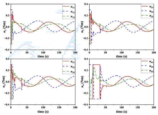 On this basis, define the diagonal control matrix with diagonal entries . To avoid singularity problems, when , and takes value in the sub-interval of [0, 1). Thus, considering the actuator saturation, the actual control torque (3) can be rewritten as [,]