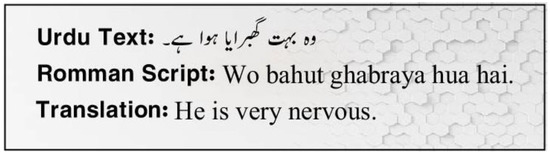 Emotion and SA classifications using English and other different language text data with abundant resources have received considerable attention. However, because there are not enough corpora with labels, emotion and SA categorization have not been thoroughly explored in languages with limited resources, such as Urdu. More than 100 million individuals worldwide consider Urdu their first language. Urdu, the language spoken officially in Pakistan, is of the Indo-Aryan family. In addition, Urdu is widely spoken in both India and Bangladesh. They do it by posting emotional messages in Urdu across a variety of social media sites [5,6]. Because of Urdu’s complicated morphology, ED and SA are more challenging than English. Urdu is difficult to understand due to a variety of issues. Its free word order, rich morphology, and multidimensional spelling are among them. This makes the job of Urdu SA and ED even more difficult. Due to the reasons above, ED and SA methods created for other languages are not necessarily applicable to Urdu. Figure 1 shows a translation from Urdu to Roman Urdu and English.