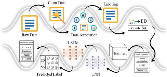 The following content provides an overview of the proposed system for data annotation with each part of the dataset framework explained in Figure 2. The suggested model collects raw data from various sources and cleans it up in a pre-processing stage to eliminate duplicates, URL links, new lines, and consistency in spelling. Annotators provide the data for annotation after it has been pre-processed, in which emotion labels are assigned to the data. In addition, we use count vectorization to extract features from the data, and then we split the dataset into a training set and a testing set. After feature extraction, the deep learning models convolution neural network (CNN) are trained with LSTM on training data and then tested. The Adam optimizer assesses the model and fine-tunes it for the best performance.