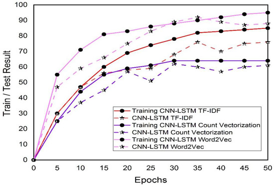 As can be observed in Figure 4, as the epoch grows, the training set’s accuracy in the text emotion detection task keeps getting better, while it decreases and subsequently increases for the test set shown by the dotted line in Figure 4. The test set accuracy peaks when the 35 epoch is trained for CNN-LSTM Word2Vec, then declines, presumably because of overfitting at the start of training. It can be stated that the outcomes of text emotion analysis are affected by either having too many or too few epoch values. The ideal results will not be reached if there are not enough epochs; however, if there are an excessive number of epochs, the model will end up overfitting the training data and will have a bad performance on the test set.