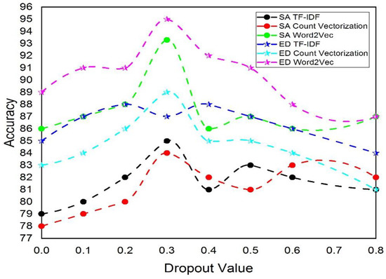 Dropout involves the removal of some neurons and the subsequent updating of the weight and bias terms in the remaining neurons throughout forward and reverse propagation. After that, neurons are removed using a probability that has been previously determined, the weight and bias term is adjusted, and the procedure is repeated until the NN is properly trained. The dropout value is changed under the assumption that all other parameters remain the same. Figure 6 displays the accuracy outcomes of the proposed models for the emotional detection and sentiment analysis dataset.