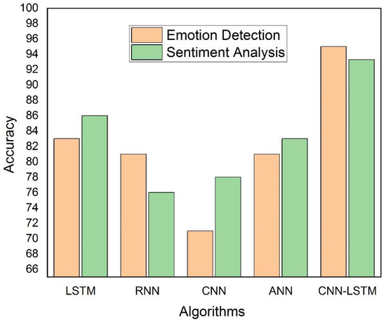 The proposed model integrates CNN and LSTM to improve each individual’s strengths. Due to its ability to better consider past and future data, LSTM outperforms competing algorithms in emotion detection and sentiment analysis. Figure 7 shows the CNN-LSTM Word2Vec model’s accuracy compared to CNN, LSTM, RNN, and ANN models. Experimental findings for ED and SA datasets show that the proposed model achieved higher accuracy than other models, about 95% for ED and 93.3% for SA, demonstrating its feasibility.