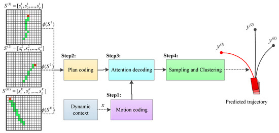 The structure of the trajectory generator based on an attention mechanism is a soft attention-guided recurrent neural network encoder–decoder [35]. There are four sub-components, including a motion encoder, plan encoder, attention-based decoder and sampling and clustering, as shown in Figure 4.