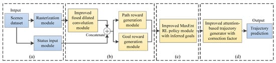 Architecture of the improved multimodal trajectory prediction method. (a) Rasterization for the traffic scene; (b) Reward initialization based on a two-stage backbone; (c) Reward updating based on the MaxEnt RL policy; (d) Trajectory generation based on the attention mechanism.