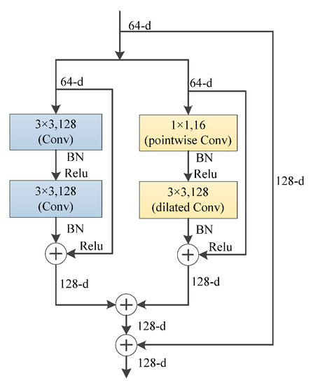 For the better deployment of deep neural networks to self-driving cars, it is necessary to reduce the number of model parameters and decrease the complexity of the network. Inspired by the design ideas of lightweight neural networks such as MobileNet [38] and SqueezeNet [39], 1 × 1 pointwise convolution has the property of equalizing the receptive field, and it is commonly used for the operation of neural network dimensional variation, with the characteristics of less parameters and less computation. We combine the dilated convolution with 1 × 1 pointwise convolution to generate an improved dilated convolution lightweight module. It is worth noting that too much use of dilated convolution to lighten the neural network may bring a large loss and lose some feature information. Therefore, an improved fused dilated convolution structure can be obtained by fusing the proposed dilated convolution block with the original residual convolution block, as shown in Figure 8. It may obtain the lightweight effect without increasing the loss of accuracy as well as achieving better trade-off between speed and accuracy.
