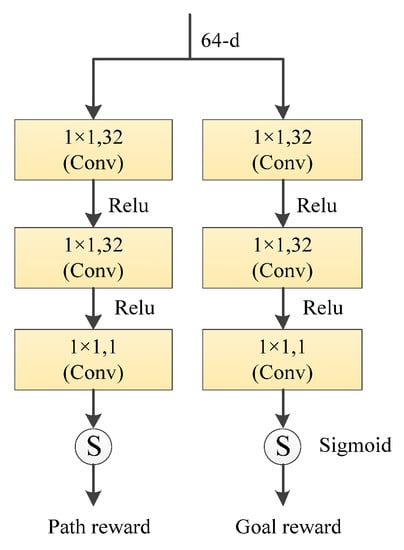 We divide the second stage full convolution module in Section 2.2 into two parts, learning the goal reward and the path reward, respectively. Specifically, the goal reward module and the path reward module have the same architecture consisting of three 1 × 1 convolutional layers. As shown in Figure 9, there are two layers with depth 32 and the one layer with depth 1 to output a single corresponding reward. Then, the log-sigmoid activation is utilized for the output, limiting the reward values between and 0.