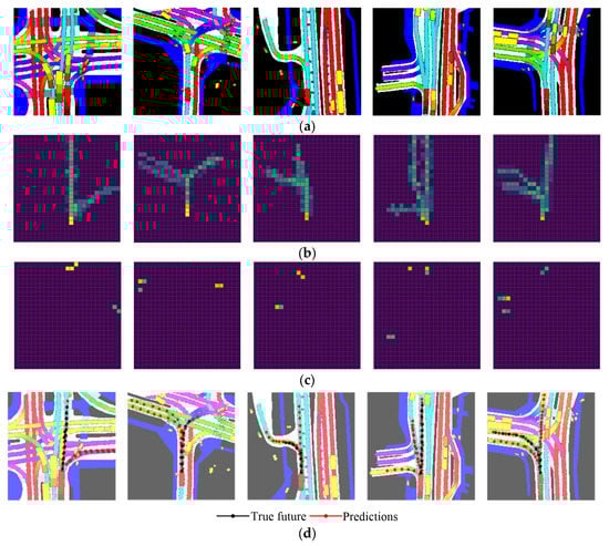 Several visualization examples of our proposed method from the nuScenes dataset are shown in Figure 11, in which Figure 11a is the raster image input. In order to distinguish the lane direction, lanes are given polygons of different colors, with red rectangles representing the target vehicle and yellow rectangles representing the surrounding vehicles. Since we are interested in the vehicle’s historical trajectory, the boundary frames captured in continuous time steps are rasterized at the map vector layer. Each historical character polygon is rasterized using the same color as the current polygon, but the brightness level is reduced to create a render effect. Figure 11b,c are path state visitation frequencies images and target state visitation frequencies images under the maximum entropy policy, respectively. The higher the brightness, the greater the visitation frequency. The aggregated trajectories finally generated by the trajectory generator are shown in Figure 11d, with the red trajectory representing prediction trajectories and the black trajectory representing the real future trajectory. The prediction does not reflect the collision. Singapore, where the dataset is collected, drives on the left, while Boston, another collection place, drives on the right as in China. Therefore, we infer that the first scene in the visual vehicle trajectory prediction is collected by Boston, and the other four scenes are collected by Singapore. It can be found that for different scenario configurations, the MaxEnt policy explores plausible paths and goal states in a 2D grid. The predicted trajectories closely correspond to the state of policy exploration and can generate a set of predictions compatible with various scenario configurations.