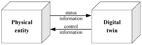 Digital twin (DT) technology maps a physical system to a digital model of information space [9]. With the assistance of high-performance sensors and high-speed communication, supplemented by data analysis and simulation, DT can integrate the data of multi-dimensional physical entities, present the actual situation of physical entities in almost real-time, and control the physical entities through a virtual–real interaction interface. A conceptual model of DT is illustrated in Figure 2, which is composed of three parts: the physical entity of the physical space, the virtual entity of the virtual space, and the interaction between the virtual and physical space [10]. DT reflects the characteristics of physical systems, and it can predict and simulate systems, thus playing a key role in resource optimization. As an emerging digital technology, DT creates virtual objects in the digital space using software definition, to accurately reflect the state, characteristics, and evolution of physical entities, so it has excellent state awareness and real-time analysis capabilities. In recent years, digital twin technology has received much attention in intelligent manufacturing, smart cities, and other fields [11,12,13].