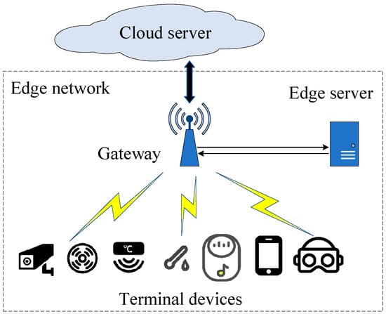 The cloud-centric architecture faces challenges in the form of bandwidth, delay, stability, resource limitation, security, etc. To overcome the limitations of the existing architecture, edge computing is proposed as a supplement to cloud computing, which can allocate tasks to edge servers that are closer to IoT devices, for direct data processing or transmission to the cloud server after preprocessing [29]. The IoT network architecture is presented in Figure 3.