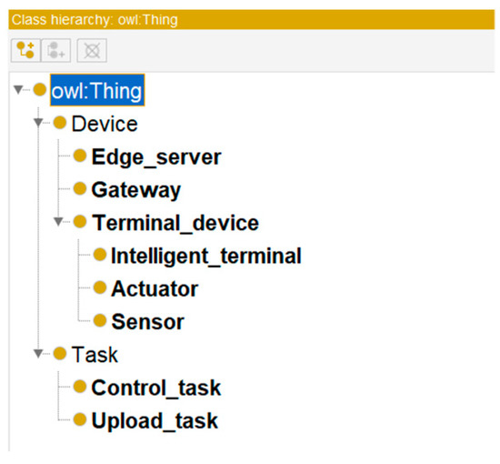 (1) Define classes and class hierarchies. The IoT device ontology mainly considers information about the devices and the tasks they perform, so two basic classes are defined: the device class, and the task class. According to the IoT network architecture, the device class is divided into three subcategories: terminal devices, gateway devices, and edge server devices. Since terminal devices have multiple types, they are further divided into fine-grained subcategories: sensors, actuators, and smart terminals. The task class is used to describe the tasks performed by the IoT device, including upload tasks and control tasks. The ontology classes and their hierarchy are illustrated in Figure 4.