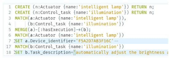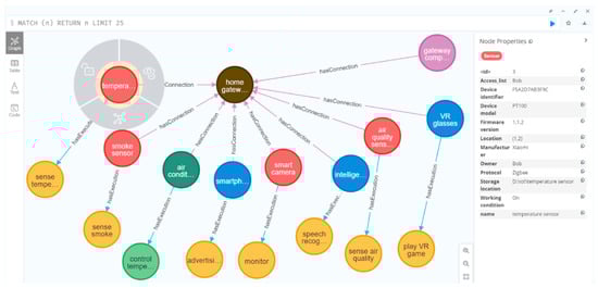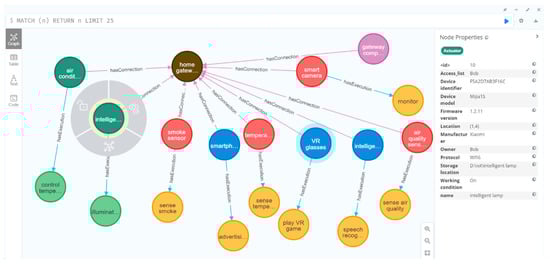 Protégé does not perform well in processing large-scale data and cannot cope with large-scale IoT device access, so the Neo4j graph database was used to instantiate the ontology, to create a knowledge graph as the network twin of the IoT. Taking the smart home scenario as an example, the knowledge graph representing the IoT network twin is shown in Figure 6.
