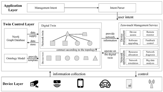 The zero-touch management architecture consists of three layers: the device layer, the twin control layer, and the application management layer. These layers are introduced in detail below: