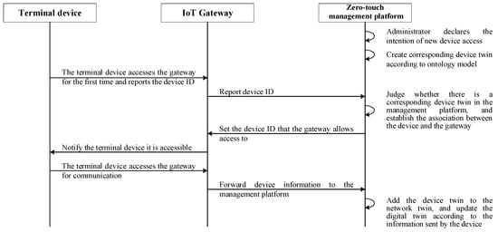 In the zero-touch management architecture, the device accessing the network is realized by establishing the corresponding device twin in the edge server. The process of IoT devices accessing the network is illustrated in Figure 8. First, in the zero-touch management architecture, the administrator declares the intention that the new terminal device will be connected to the network and creates the corresponding device twin according to the ontology template. Then, the terminal device accesses the gateway for the first time, determines whether the corresponding device twin exists through the zero-touch management architecture, and the association between the gateway and the terminal device is established. Finally, the device communicates with the gateway, and the device twin is added to the network twin, according to the connection.