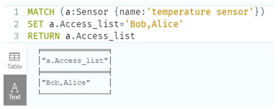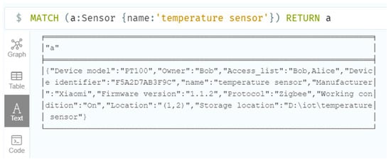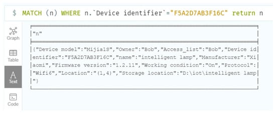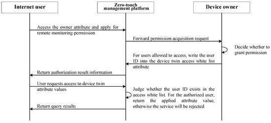 When a user performs remote monitoring management operations, they need to consider the access control issue. Only users with access rights to the device can query the device information through the graph database. The access control issue of the device twin is set through the entity attributes. The owner attribute of the device twin represents the owner of the corresponding device, and it has read and write permissions for the device twin operation. The owner can specify users that can access the twin information of the device and write user information into the access list attribute of the twin device. Therefore, we solve the access control issue, by controlling the access list attribute of the device twin, and only the user appearing in this attribute can read the corresponding device information. The operation flow of the user’s remote monitoring of the device is presented in Figure 9.