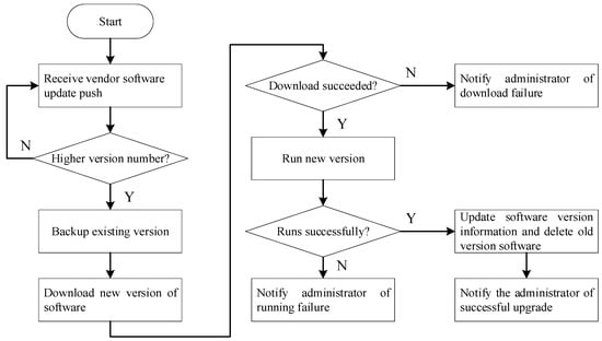 The zero-touch management architecture periodically queries the device manufacturer for software updates for the device models it manages and compares them with the current version of the device. This information, including the device model, device manufacturer, and device software version, is stored in the device twin for quick access. If the device version issued by the manufacturer is newer than the current one, the current software version is backed up, the new version of the software is downloaded from the device manufacturer and run on the device, and the administrator is informed of the successful software upgrade. The software upgrade process of IoT devices is illustrated in Figure 10.