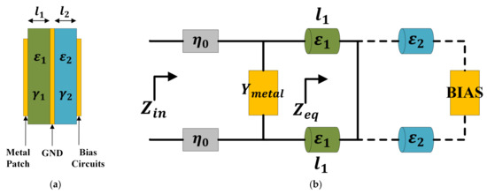 According to the propagation path of the incident electromagnetic wave, the equivalent circuit (EC) model of the MSRRA can be modeled by means of using equivalent inductors, capacitors, resistors, and transmission lines, which represent the metal patch, dielectric mediums, the ground plane, and varactor diodes in the MSRRA system. A sketch of the MSRRA and its equivalent circuit are illustrated in Figure 1. The second substrate’s medium layer with permittivity and propagation constant has no contribution to the MSRRA and is neglected, since it is under the ground plane. The total EC model is a parallel RLC resonant circuit.