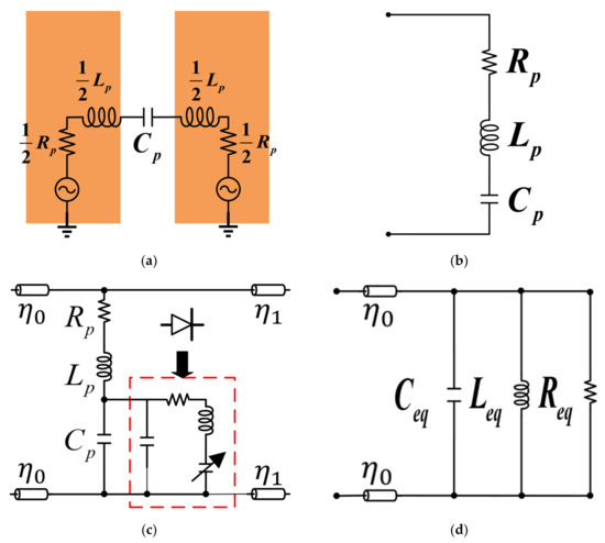 When the MSRRA is illuminated, the induced electric field appears across the gap between the two microstrip patches. On average, this effect can be equivalent to a sheet capacitance . The high-frequency currents flow back and forth between the capacitive gap, so the patches can be equivalented as serials of effective inductive impedance and a resistance as shown in Figure 2a,b. A MACOM varactor diode (MAVR–011020–1411) [30], Ref. [31] is used in this MSRRA, and can provide extra capacitance. With the spice model provided by the manufacturer, we can easily obtain an EC model of the metal patch with a varactor on it, as shown in Figure 2c. Finally, we can set up the whole model, as shown in Figure 2d; the MSRRA can be equivalented to a parallel RLC resonant circuit.