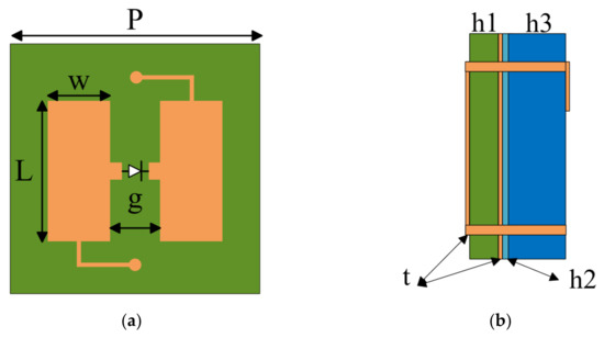 Guided by the EC model of the unit cell, the configuration of the proposed MSRRA unit cell is shown in Figure 3. It is a multi-layer structure; the periodic of the unit cells is 4 mm. On the top layer, two microstrip patches with 0.035 mm thickness make up the unit cell scatterer. The RT5880LZ (εr = 2.2 and tanδ = 0.0009) substrate medium with 0.508 mm thickness makes up the second layer of the unit cell. Below the RT5880LZ substrate medium, a metal plane with 0.035 mm thickness acts as the ground plane which helps to improve the reflection efficiency of the MSRRA. The FR-4 (εr = 4.4 and tanδ = 0.018) substrate medium with 1.016 mm thickness makes up the second substrate layer, which mainly strengthens the whole unit cell structure. Between the ground plane and FR-4 substrate medium, an FR-4 prepreg layer with 0.2 mm thickness is used to bond the upper and lower structure together, as shown in Figure 3b. The bottom layer of the MSRRA unit cell contains the DC-bias network circuits, which provide DC bias for the varactor diode. All the unit cell structure parameters, which have been iterated and optimized, guided by the EC model, are summarized in Table 1. A varactor is placed between the microstrips patches, adding variable capacitance to the unit cell. The dynamic range of the capacitance is = 0.22 pF to = 0.033 pF for 0–16 V reverse bias voltage.